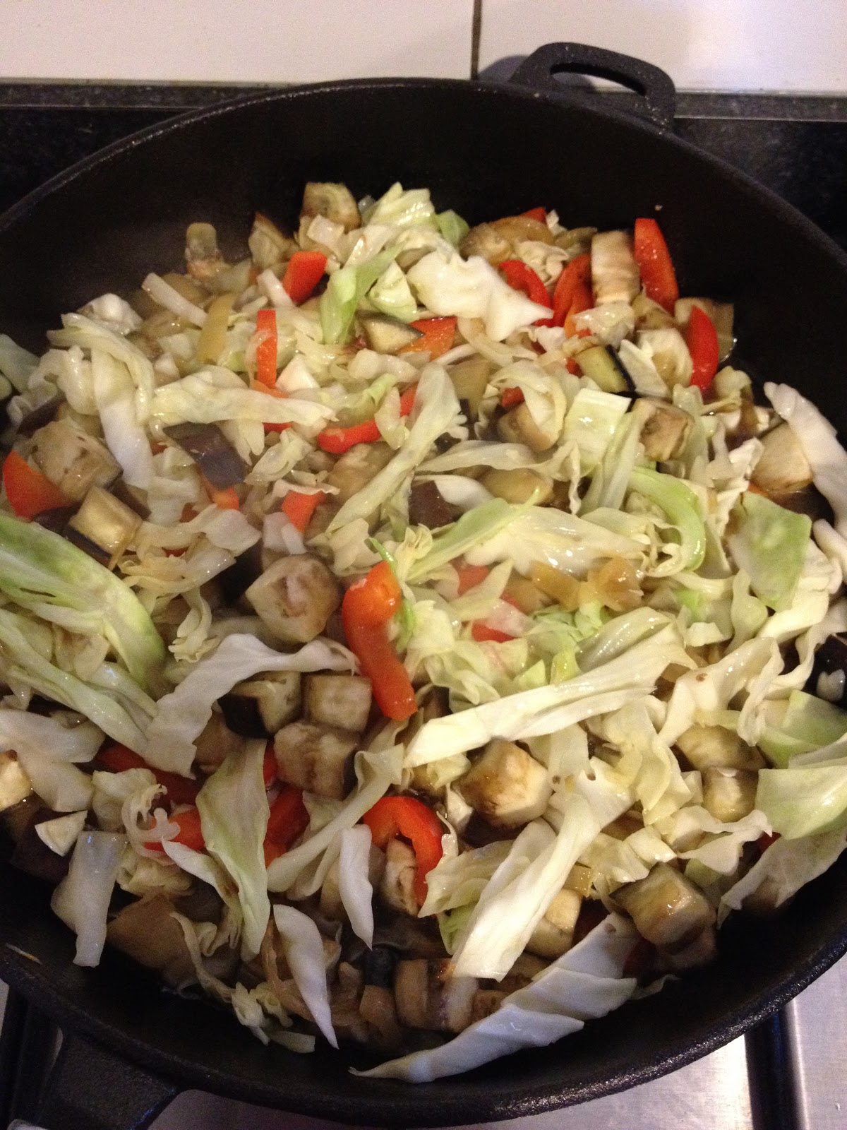 For the vegetables, I just chopped up what I had in the fridge (more cabbage, some red capsicum, and another eggplant), heated some coconut oil in a frypan and cooked them all together. I may have added some crushed garlic in first...I can't quite remember! Once the chicken was done, I tipped the onions and some of the juice (not all of it, or the vegetables will get drowned) from the chicken into the other vegetables and cooked for another few minutes before serving.
